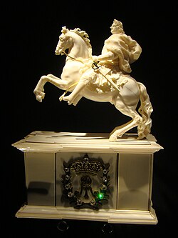 | Hist. Exponat, Schlossmuseum Gotha, Schloss FriedensteinReiterstatuette Augusts des Starken, wohl von Wilhelm Krüger, Dresden, um 1715/20 | Eigenes Werk | Peter Schmelzle | Datei:Gotha-exponate-004.jpg |