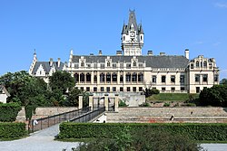 Nordwestansicht des Schlosses Grafenegg in der niederösterreichischen Marktgemeinde Grafenegg . Urkundlich 1294 als Festes Haus mit Mauer und Graben aufscheinend, wurde die Anlage 1645 im Zuge des Dreißigjährigen Krieges durch die Schweden gestürmt. Anschließend erfolgte die Wiederinstandsetzung und der Ausbau zu einer Vierflügelanlage. Von 1845 bis 1872 fand ein weiterer Aus- und Umbau zu einer romantisch-historistischen Schlossanlage statt und das Schloss erhielt dabei im Wesentlichen sein heutiges Erscheinungsbild. Die schweren Schäden infolge von Kriegs- und Nachkriegsereignissen wurden durch eine Restaurierung und Wiederinstandsetzung ab 1967 behoben. | Eigenes Werk | C.Stadler/Bwag | Datei:Grafenegg - Schloss, Nordwestansicht.JPG | |