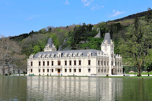 | Südansicht des Schlosses Hernstein in der niederösterreichischen Marktgemeinde Hernstein und hinter dem Schloss der Rest des Wehrturmes der Burgruine Hernstein. Karl Josef Graf Heussenstein ließ zwischen 1727 und 1730 den vorhandenen Meierhof zu einem "Hofhaus" umbauen. 1798 wurde Freiherr Heinrich von Müller Besitzer der Liegenschaft und ließ den teilweise ummauerten Park und den künstlich aufgestauten Teich mit der Insel anlegen. 1830 erwarb Erzherzog Rainer das schlichte Anwesen, das aus vier zweigeschossigen Trakten bestand, die sich um einen rechteckigen Innenhof gruppierten. Sein Sohn, Leopold Ludwig , beschloss 1855 das Gebäude als Jagdschloss im Stil der von ihm bevorzugten englischen Gotik adaptieren zu lassen und beauftragte diesbezüglich Theophil von Hansen , der dabei eine der bedeutendsten Anlagen des Historismus schuf. 1963 erwarb die Wiener Handelskammer das Anwesen, sanierte es und eröffnet 1966 darin das Hernstein International Management Institute . 1976 wurde nordwestseitig des Schlosses ein moderner Hotelbau für die Seminargäste errichtet. | Eigenes Werk | C.Stadler/Bwag | Datei:Hernstein - Schloss.JPG | |