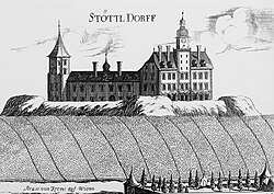 Schloss Juliusburg , auch als Schloss Stetteldorf bezeichnet, in der niederösterreichischen Marktgemeinde Stetteldorf am Wagram . Ein Stich aus dem Jahr 1672 von Georg Matthäus Vischer . | Topographia archiducatus Austriae Inferioris modernae (Schautafel beim Schloss anlässlich Tag des Denkmals 2012) | Georg Matthäus Vischer | Datei:Stöttldorff.JPG |