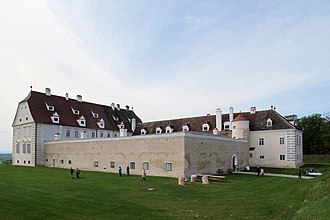 Die Hauptfassade bzw. der Osttrakt des Schlosses der Schlossanlage Schloss Hof in der niederösterreichischen Marktgemeinde Engelhartstetten . Die Schlossanlage wurde um 1627 auf einer Geländekante und östlich der mittelalterlichen Feste Hof errichtet. Nachdem 1725 Prinz Eugen die Anlage erworben hatte, baute er diese zu einem repräsentativen Landsitz aus. 1755 kam das Schloss in den Besitz von Maria Theresia . Von 1773 bis 1775 erfolgte dann ein Um- und Ausbau zum heutigen Erscheinungsbild durch Franz Anton Hillebrandt . | Eigenes Werk | C.Stadler/Bwag | Datei:Engelhartstetten - Schloss Hof (2).JPG | |
