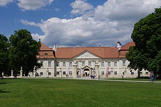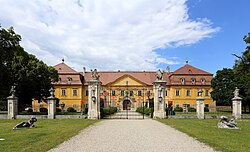 | Die Hauptfassade bzw. der Osttrakt des Schlosses der Schlossanlage Schloss Hof in der niederösterreichischen Marktgemeinde Engelhartstetten . Die Schlossanlage wurde um 1627 auf einer Geländekante und östlich der mittelalterlichen Feste Hof errichtet. Nachdem 1725 Prinz Eugen die Anlage erworben hatte, baute er diese zu einem repräsentativen Landsitz aus. 1755 kam das Schloss in den Besitz von Maria Theresia . Von 1773 bis 1775 erfolgte dann ein Um- und Ausbau zum heutigen Erscheinungsbild durch Franz Anton Hillebrandt . | Eigenes Werk | C.Stadler/Bwag | Datei:Engelhartstetten - Schloss Hof (2).JPG | |