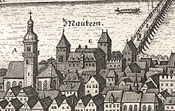 Schon 899 wurde Mautern als civitas Mutarensis in den Reichsannalen, 903 dann als Zollstelle in der Raffelstettener Zollordnung erwähnt.[2] Damals existierte dort ein altes römisches Kastell, das dem Markgrafen Isanrich gehörte und von Herzog Arnulf I. erobert wurde.[3] Ab 972[4] unterstand Mautern den Bischöfen von Passau, die Pfleger (später Hauptmann genannt) einsetzten, um die weltliche Herrschaft auszuüben und den Verkehr über die Donau zu überwachen. Diese Verwalter wohnten in einem Wehrhof, der in die Nordwestecke der Stadtbefestigung eingebunden war und in dessen Bereich auch die Landestelle der damaligen Fähre sowie die Mautstelle zu suchen sein dürften.[5][6]