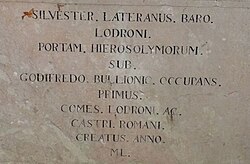„SILVESTER LATERANUS BARO LODRONI PORTAM HIEROSOLIMORUM SUB GODFREDO BULLIONIO OCCUPANS PRIMUS COMES LODRONI AC CASTRI ROMANI CREATUS ALLO ML.“