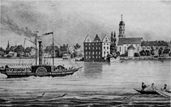 | Die Kronprinz von Würtemberg vor dem ausgebrannten Schloss Montfort in Langenargen | Karl F. Fritz, Abenteuer Dampfschiffahrt auf dem Bodensee, S. 23 | Autor/-in unbekannt Unknown author | Datei:Kronprinz von Würtemberg um 1850 vor Langenargen.jpg | |