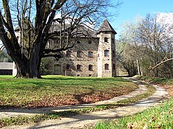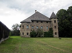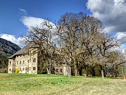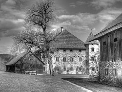 | Schloss Pöllan , ein Meierhof in Pöllan bei Paternion im Unteren Drautal in Kärnten / Österreich / Europäische Union um 2011. Ansicht gegen Westen. Erbaut wurde der unvollendete Bruchsteinbau von Christoph Haidenreich, einem protestantischen Pfleger der Freyherrschaft Paternion von 1598-1616, der aufgrund der Gegenreformation zum Verkauf und ins Exil gezwungen wurde. Ab 1616 war das Schlösschen im Besitz von Moritz Christoph Khevenhüller . | Eigenes Werk | Joadl | Datei:Paternion Schloss Pöllan Mayerhof 2011 0514b.jpg | |