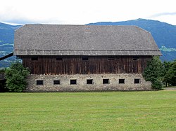 | Früherer Stall und Scheune (Stadl) von Schloss Pöllan , einem Meierhof in Pöllan bei Paternion im Unteren Drautal in Kärnten / Österreich / Europäische Union um 2011. Ansicht gegen Norden. Im Hintergrund der östliche Teil des Mirnocks. Der obere Teil des Gebäudes aus Holz diente als Scheune für das Heu. Im unteren Teil war der Stall für Kühe und Pferde. Das Gebäude steht heute leer und wird nicht mehr benützt. | Eigenes Werk | Joadl | Datei:Paternion Schloss Pöllan Mayerhof 2011 0722.jpg | |
