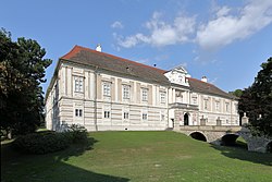 | Ostansicht des Schlosses Harrach in der niederösterreichische Marktgemeinde Rohrau . Das Schloss ist seit 1542 im Besitz der Grafen Harrach. Im 16. Jahrhundert erfolgte der Ausbau der mittelalterlichen Grenzburg zu einem Wasserschloss. Umbauten erfolgten 1688 sowie 1722 und 1776/77 erhielt das vierflügelige Schloss im Wesentlichen sein heutiges Erscheinungsbild. | Eigenes Werk | C.Stadler/Bwag | Datei:Rohrau - Schloss Harrach (2).JPG | |