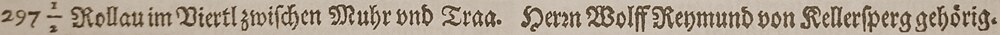 | 297 1/2 Rollau im Viertel zwischen Muhr und Traa.Herrn Wolf Reymund von Kellersperg gehörig. | Topographia Ducatus Stiriae 1681 | Georg Matthäus Vischer | Datei:Rollav.jpg | |