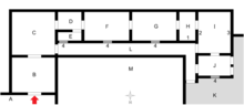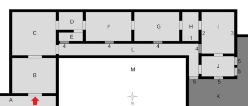 | Schloss Rosenau, Grundriss des Österreichischen Freimaurer-Museums im ersten Stock: A– Treppenhaus und Vorhalle mit freimaurerischen Fresken; B– Ausstellungsraum 1 (Einführung); C– Ausstellungsraum 2 (genutzt für Sonderausstellungen); D– Ausstellungsraum 3 (ehemaliges Eingangszimmer der Loge); E– Dunkle Kammer; F– Ausstellungsraum 4 (ehemaliger Ankleideraum der Loge); G– Ausstellungsraum 5 (ehemaliges Speisezimmer der Loge); H– Ausstellungsraum 6 (Marmorkabinett); I– Tempel der Loge; J– Ausstellungsraum 7 (Zugangszimmer zu den Kirchenemporen); K– Schlosskirche ("Pfarrkirche hl. Dreifaltigkeit, Schloss Rosenau"); L– Ausstellungsraum 8; M– Schlosshof; 1– Kaminsims mit Obelisk; 2– Sitz des Meisters vom Stuhl; 3– Sitze der Aufseher; 4– ehemalige Durchgänge; 5– Zugänge zu Kirchenemporen. | Eigenes Werk | ImprovementUK | Datei:Rosenau Castle - Austrian Museum of Freemasonry wing.tif | |