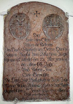 | Grabdenkmal des Johann Baptist von Pflachern (+ 1742) und seiner Gemahlin Maria Ursula Antonia geb. von Rainer (+ 1758) in der Pfarrkirche von Andorf. Eine wissenschaftliche Bearbeitung des Denkmals liegt vor in SEDDON Christopher R., Die inschriftlichen Denkmäler der Herren und Freiherren von Hackledt. Grablegen, Memoria und Repräsentation eines Innviertler Landadelsgeschlechtes, Wien (Dipl. Arb.) 2002 , S. 182-184. | Eigenes Werk | ViennaUK | Datei:Pfarrkirche Andorf - innen - Monument 01 Pflachern.JPG | |
