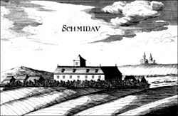 | Schloss Schmida | Veröffentlicht in Alfred Auer und Herbert Fritz: Klein- und Flurdenkmale - sowie sonstige vom Menschen geschaffene Merkwürdigkeiten - in der Marktgemeinde und Pfarre Hausleiten „Marterlführer“; Edition Club Hausleiten; Hausleiten 2008, ISBN 978-3-902368-19-5 ; Ein Original hängt im Pfarrhof von Hausleiten | Georg Matthäus Vischer | Datei:5 Sd 09a Schloss Schmida.jpg | |