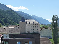 | Schloss Sigmundsried von der Schulerwiese aus Dieser landesfürstliche Turm war im 13. und 14.Jahrhundert Wohnsitz der Herren von Ried; von hier aus wurde der Verkehr auf der Landstraße überwacht. 1471 ließ Erzherzog-› Sigmund ihn zum Jagdschloss Sigmundsried ausbauen.1550 verlegt der Ritter Veith von Wehingen den Gerichtsitz von Laudegg auf Sigmundsried. 1684-1775 war das Schloss im Besitz der Familie Sterzinger, die durch mehrere Generationen das Richteramt innehatte. 1841 erwarb es der Staat und baute es als Gerichtsgebäude um. Die Gerichtsverwaltung wurde damals endgültig von Laudegg nach Ried verlegt. Bis 1978 war hier ein Bezirksgericht. In der Eingangshalle des Gebäudes, das seit 1999 der Gemeinde gehört, sind schöne Ranken- und Wappenmalereien aus dem 16.Jahrhundert erhalten. | Eigenes Werk | Gpatsche | Datei:Sigmundsried Schloss im Oberinntal.JPG | |