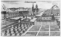 | G. M. Vischers Käyserlichen Geographi, Topographia Ducatus Stiriae, Das ist: Eigentliche Delineation / und Abbildung aller Städte / Schlösser / Marcktfleck / Lustgärten / Probsteyen / Stiffter / Clöster und Kirchen / so es sich im Herzogthumb Steyrmarck befinden; Und anjetzoUmb einen billichen Preyß zu finden seyndBey Johann Bitsch Universitäts Buchhandlern /Auff dem Juden=Platz bey der guldenen Saulen. Graz 1681 Die Nummerierung der Dateien folgt der alphabetischen Reihung der Ortsnamen | Topographia Ducatus Stiriae | Georg Matthäus Vischer | Datei:Vischer - Topographia Ducatus Stiria - 131 Graz Sankt Gotthard.jpg |