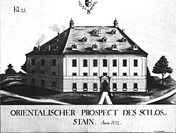 | Schloss Stein aus dem Orientalischen Prospekt (1772) von Schnepf | Orientalischer Prospekt - Schloß Stain 1772 von Schnepf | Schnepf (?) | Datei:Stein 1772.jpg |