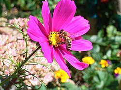 Blütenstand einer Sorte von Cosmos bipinnatus mit Honigbiene |