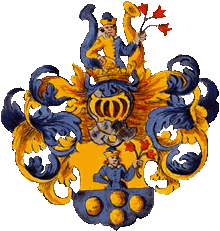 Geviertet. 1 und 4 in Gold ein goldgekrönter rotbezungter schwarzer Adler am Spalt. 2 und 3 in Rot ein silberner Sparren, am Schildeshaupt ein grau-blauer Balken mit drei sechszackigen goldenen Sternen. - Auf den zwei Helmen, rechts mit schwarz-goldenen Decken, ein goldgekrönter rotbezungter schwarzer Adler und links mit rot-silbernen Decken zwischen zwei von rot und silber eingebundenen Büffelhörnern, der Sparren auf dessen Spitze ein goldener sechszackiger Stern ruht.