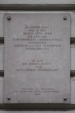 | Gedenktafel an der Hauptfront vom heutigen Musikgymnasium Wien zur ehemaligen Schottenfelder Realschule.Text: In diesem Haus war in den Jahren 1874 - 1968 die 1851 als Schottenfelder Oberrealschule gegründete älteste Realschule Österreichs untergebracht. Sie war die Bildungsstätte vieler bedeutender Österreicher. Vom Club der Erhaltung der Schottenfelder Kollegentage. 1969. | Eigenes Werk | Anton-kurt | Datei:Schottenfelder Realschule 01.jpg | |