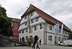 | Das Bild zeigt das 1451/52 erbaute Kornhaus in Ravensburg . Das Kornhaus (schwäbisch: Schranne) diente bis ins 20. Jahrhundert hinein als Lager- und Handelshaus für Getreide aus ganz Oberschwaben . Heute beherbergt das Gebäude die Stadtbibliothek. | Selbst fotografiert | Norbert Kaiser | Datei:Ravensburg Kornhaus Stadtbücherei (01-2).jpg | |