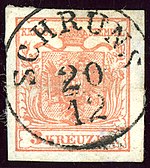 | Austrian KK 3 kreuzer stamp, issue 1850, Ferchenbauer type Ia, cancelled at SCHRUNS, Vorarlberg, Austria. | Eigener Scan | Jacquesverlaeken | Datei:1850 KK 3kr typeIa Schruns.jpg | |