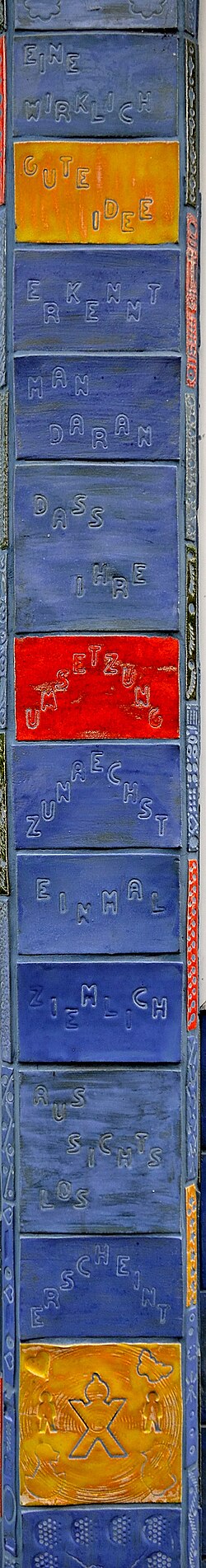 | Mosaik am Schulzentrum Friesgasse im 15. Wiener Gemeindebezirk. Eine wirklich gute Idee erkennt man daran dass ihre Umsetzung zunächst einmal ziemlich aussichtslos erscheint | Eigenes Werk | Herzi Pinki | Datei:Mosaik am Schulzentrum Friesgasse 01.jpg | |
