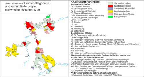 Der schwäbisch-österreichische Teil der Vorlande war die Markgrafschaft Burgau, die Landgrafschaft Nellenburg, Teile des späteren Fürstentums Fürstenberg, die Reichslandvogtei Schwaben, die Grafschaft Hohenberg, Tettnang, Ehingen und weitere fünf Donaustädte Mengen, Munderkingen, Riedlingen, Saulgau und Waldsee. Dazu kamen teilweise die geistlichen Territorien der oberschwäbischen Prälatenbank der Benediktiner, Prämonstratenser und Zisterzienser, die sich dem Kaiser in Wien hinsichtlich des Schutzrechtes unterstellt hatten.[1]