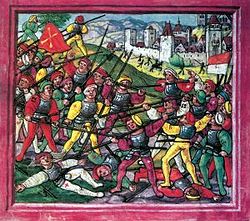 | Schlacht bei Hard während des Schwabenkrieg . Im Hintergrund die Eidgenössischen Truppen mit den Bannern von Luzern, Zürich (mit rotem Schwenkel), Uri, Schwyz (halb verdeckt im Hintergrund, Unterwalden und Zug. Die Eidgenossen sind weiter an den weissen Kreuzen auf ihren Kleidern zu erkennen. Im Vordergrund der Bodensee. | 1 . | Diebold Schilling the Younger (d. 1515) | Datei:Battle of Hard.jpg | |