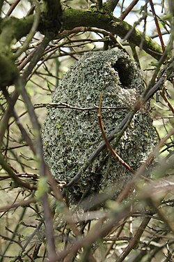 Das Nest kann in Laub- wie Nadelbäumen, in rankenden Pflanzen, Hecken oder Büschen, in Wurzel- oder Dorngestrüpp, in Reisighaufen oder am Boden stehen. In Ausnahmefällen gab es Bruten in Höhlen oder Nistkästen. Die Höhe des Neststands ist sehr variabel, liegt aber meist zwischen 1,5 und 6 m.[16] Nur ausnahmsweise wird das Nest am Boden oder in bis zu 30 m Höhe gebaut. Bei Laub- und jungen Nadelbäumen befindet es sich meist stehend in Stammnähe, bei alten Nadelbäumen wird es auch oft hängend in die äußeren Zweige gebaut. Solche Nester befinden sich meist recht hoch. Die Öffnung ist in der Regel zur sonnigsten Seite hin ausgerichtet.
