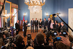 | Ministerpräsident Volker Bouffier ernennt am 18.01.2014 im Hessischen Landtag die Minister seines zweiten Kabinetts und der ersten schwarz-grünen Koalition in einem Flächenland | Eigenes Werk / MartinKraft.com | Martin Kraft | Datei:Kabinett Bouffier II-Ernennung-Totale.jpg | |