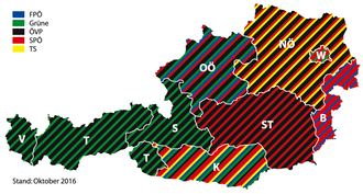 - 1 2 3 4 Die rote Beteiligung in Oberösterreich, die gelbe Beteiligung (Team Stronach) in Kärnten und die rote und gelbe in Niederösterreich sind nominell und beruht auf dem Proporzsystem. Die „Koalition“ ist in diesen Landtagen eine inoffizielle Vereinbarung zur Zusammenarbeit zwischen einigen der Regierungsparteien.