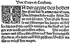| Beschreibung des Schwefel-Bads | Lorenz Fries . "Tractat der Wildbeder natuer." Hans Grüninger , Straßburg | Autor/-in unbekannt Unknown author | Datei:Fries Embs 1519.jpg | |