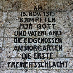 Im Herbst 1315 zog der Bruder Friedrichs, Herzog Leopold von Österreich, dem die Verwaltung der habsburgischen Ländereien in den Vorlanden oblag, ein Heer in Zug zusammen, um die Schwyzer zu bestrafen. In einem konzentrischen Angriff wollte Leopold zusammen mit Otto von Strassberg und dem Adel von Luzern die drei Waldstätte über den Brünig, über den Vierwaldstättersee sowie von Norden her angreifen. Am 15. November 1315 fand mit der Schlacht am Morgarten die erste bewaffnete Kampfhandlung zwischen den Eidgenossen und den Habsburgern statt. Der Eidgenossenschaft gelang es, ein zahlenmässig und technisch überlegenes Heer zu schlagen. Nach dieser Niederlage verzichteten die Habsburger vorläufig auf weitere militärische Angriffe. Noch im Dezember 1315 erneuerten und erweiterten Uri, Schwyz und Unterwalden den Bund von 1291 im Sinn eines engeren politischen Zusammenrückens gegen die habsburgische Bedrohung. So sollten sämtliche Feudalabgaben aus dem Gebiet der Waldstätte für die Dauer des Krieges ausgesetzt werden, und die drei Länder verpflichteten sich auf eine gemeinsame Aussenpolitik. Die Feindschaft zwischen den Habsburgern und dem römisch-deutschen König Ludwig dem Bayer liess letzteren im März 1316 durch ein Lehensgericht sämtliche Rechte der Habsburger in den Waldstätten aufheben. Ausserdem erneuerte er die alten Freiheitsbriefe und stellte den Gotthard völlig unter die Kontrolle Uris, indem er 1317 den Urner Landammann als Reichsvogt über das Tal Urseren einsetzte. Durch die weiteren Entwicklungen in der Reichspolitik sahen sich die Habsburger 1318 gezwungen, den Waldstätten einen Waffenstillstand zu gewähren, der vorerst nur zehn Monate gelten sollte, jedoch mehrfach verlängert wurde. Die Waldstätter ermöglichten im Austausch die Wiederaufnahme des Handels und liessen auch die Feudalabgaben an Habsburg wieder zu. Die Habsburger akzeptierten den Verlust der Innerschweiz formell jedoch nicht, sondern bemühten sich weiter um die Wiedererrichtung ihrer Machtposition von vor 1291.[2]