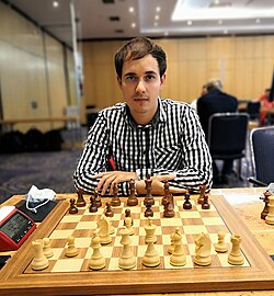 | Porträt von Großmeister Sebastian Bogner Bundesliga Endrunde 2021 am Schachbrett. Auf dem Brett ist eine Damengambitstellung nach wenigen Zügen Aufgebaut. Derivat des Bildes Sebastian Bogner BL Endrunde 2021 Bild 4.jpg | Eigenes Werk | Robert Radke | Datei:Sebastian Bogner BL Endrunde 2021 Bild 4 zugeschnitten.jpg |