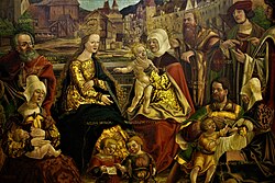 | Ausschnitt des Mittelbildes vom Annenberger Altar, gemalt 1517 von Michael Scheel. Er zeigt Maria, das Jesuskind und weitere Mitglieder der Familie, der "Heiligen Sippe". | Eigenes Werk | Pakeha | Datei:Heilige Sippe (Annenberger Altar).jpg | |