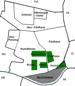 Per 1. Jänner 1892 wurden viele Vororte Wiens jenseits des Linienwalls eingemeindet. Im Zuge dessen wurde Sechshaus mit Rudolfsheim zum 14. Bezirk, Rudolfsheim, konstituiert. 1905 kam es zu einigen Grenzberichtigungen bei den Bezirken, die Grenze zwischen dem damaligen 14. und dem 12. Bezirk (Gaudenzdorf) wurde an den nunmehr regulierten Wienfluss verlegt, sie war vorher entlang der heutigen Diefenbachgasse verlaufen.