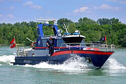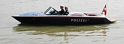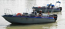 | Das Polizeiboot „Wien“ der Polizeiinspektion Handelskai-Wasserpolizei auf Höhe Handelskai 343 bzw. des Yachthafens Donaumarina im 2. Wiener Gemeindebezirk Leopoldstadt. Das über 15 m lange Schiff wurde um rd. 960.000 Euro von der ÖSWAG Werft Linz gebaut und im August 2012 in Dienst gestellt. Die Höchstgeschwindigkeit des rd. 15 Tonnen schweren Schiffes beträgt etwa 40 km/h ( 1 ), die durch 2 IVECO-Motoren mit je 258 kW Leistung ermöglicht wirdː 2 . | Eigenes Werk | C.Stadler/Bwag | Datei:Polizeiboot „Wien“.JPG |