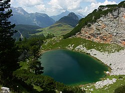 | Ansicht von Westen. Im Hintergrund das Seehorn. Der Aufstiegsweg führt rechts am See vorbei. |