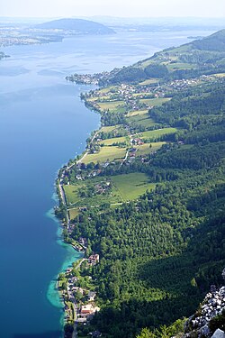 | Steinbach am Attersee mit der Seeleiten Straße am Ostufer des Attersees, Österreich | Eigenes Werk | Tigerente | Datei:Steinbach am Attersee Seeleiten Straße 20210605.jpg |