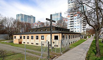 | Südansicht der Seelsorgestation und Filialkirche St. Martin im 21. Wiener Bezirk Floridsdorf . Die kirchliche Mehrzweckhalle wurde von 1979 bis 1980 im Zuge der Errichtung des Gemeindebaus Franz-Koch-Hof nach Plänen der Architekten-Planungsgemeinschaft IGIRIEN (Elsa Prochazka, Werner Appelt und Franz E. Kneissl) errichtet. | Eigenes Werk | C.Stadler/Bwag | Datei:Floridsdorf (Wien) - Seelsorgestation St. Michael.JPG | |