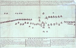 | HMS Marlborough (90 guns) after fight at Toulon (1744). The ship was severely damaged by the Spanish Real (110 guns) and Hercules (64 guns). A draught of the Marlborough as she appeared in the late Engagement in the Mediterranean Febry. 11, 1743 Marlborough of 90 guns, Capt. Cornwell, engaged by the Reall of 114 guns and Hercules of 64, the Rear of Admiral Mathews Division being to windward: Capt. Cornwell was killed. Capt. of y. soldiers Killed, first Lieut lost one arm. Mastr. both Leggs. 45 Men killed at their quarters, 125 lost leggs and arms.Lieuts.: 1. Frederick Cornwell. 2. Timothy Nucella 3. Inc. Haile 4. Inc. Ballet. 5. Matthew Moore. 6. Frederick Hyde. (PAD5219) Repro ID: pu5219 | nmm.ac.uk | Auteur inconnu | Datei:HMS Marlborough apres bataille de Toulon 1744 anonyme.jpeg | |