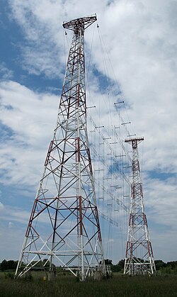 | Quadrantantennen am Sender Moosbrunn Zwei, umschaltbare Quadrantantennen im einem Abstand von 92,3 m Die Quadrantantenne im Vordergrund ist für 7 MHz bzw. 9 MHz mit Höhe über Grund von 14,3 m Die Quadrantantenne im Hintergrund ist für 5-6 MHz mit Höhe über Grund von 22 m In der Mitte zwischen den beiden Quadrantantennen ist die Umschaltvorrichtung erkennbar. Leistung der beiden Antennen: je 100 kW | Eigenes Werk | Ulrich Eitler | Datei:Moosbrunn Quadrantantennen.JPG | |