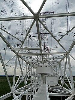 | Im Inneren der großen Drehstandantenne für Kurzwelle am Sender Moosbrunn Erkennbar links oben das Reflektornetz und beidseitig davon je ein Antennenfeld für unterschiedliche Frequenzbereiche: Frequenzbereiche 1: 49m-, 41m-, 31m-Band Frequenzbereiche 2: 25m-, 19m-, 16m-, 13m-Band Leistung der Antenne: 500 kW | Eigenes Werk | Ulrich Eitler | Datei:Moosbrunn Drehstandantenne im Tragwerk.JPG | |