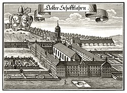 | Michael Wening: Kloster Schäftlarn im Isartal. Der Neubau der Klostergebäude um die gotische Klosterkirche wurde zwischen 1702 bis 1707 errichtet. Wenings Stich von 1701 zeigte daher zunächst nur das geplante Projekt, das in dieser Form auch verwirklicht wurde. Erst 1733 kam die alte Kirche zum Abbruch und wurde durch einen barocken Neubau ersetzt. | Michael Wening: Historico-topographica descriptio Bavariae. Das ist: Beschreibung, dess Churfürsten- und Hertzogthumbs Ober- und Nidern Bayrn, welches in vier Theil oder Rennt-Aembter, als Oberlands München und Underlands Burgkhausen, aber in Landshuet unnd Straubing abgetheilt ist Straub, München 1701 | Michael Wening (1645–1718) | Datei:Michael Wening - Kloster Schäftlarn.jpg | |