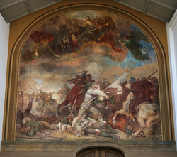 | Fresko "Die Sendlinger Bauernschlacht 1705" von Wilhelm Lindenschmit der Ältere an der Alten Pfarrkirche St. Margaret in München-Sendling | eigenes Foto | Herbert Thiess, München, www.herbert.thiess.de | Datei:SendlingerMordweihnacht1.png |