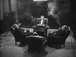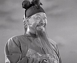 | Prince Alexander Nevsky (Nikolay Cherkasov, right) speaking to the Mongol envoy (Liang Qung, left). Still from the film Alexander Nevsky by Sergey Eisenstein. | Russian Wikipedia , original description was/is here . | Sergey Eisenstein (director) | Datei:Nevski7.jpg |