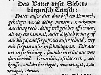 | Das Vaterunser auf Siebenbürgisch-Sächsisch aus dem Jahr 1666 | Johannes Tröster, Das Alt- und Neu-Teutsche Dacia, Nürnberg, 1666 | Johannes Tröster | Datei:Das Vaterunser auf Siebenbürgisch-Sächsisch 1666.jpg |