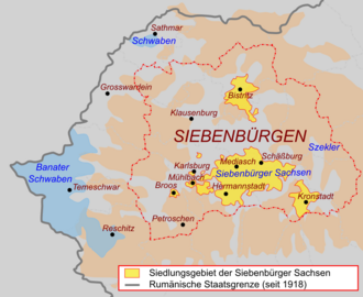 | Siedlungsgebiete der Siebenbürger Sachsen | Eigenes Werk . Based on File:Deutschsieben bürgen-de.svg and File:Evangelische Kirche in Siebenbuergen 1904.JPG | DietG | Datei:Deutsche in Siebenbürgen.png | |