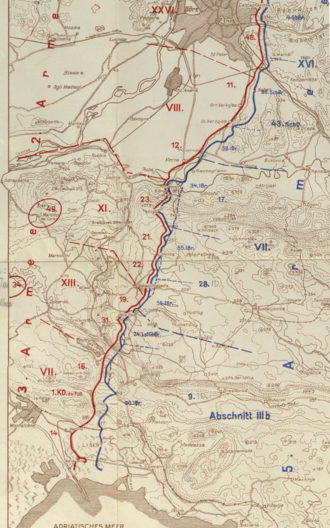 Damit hatte sich der Bestand an 102.000 Feuergewehren[3] Anfang August bereits vier Wochen später auf 148.000 Feuergewehre erhöht. Auf der Österreich-Ungarischen Seite glaubte man sich aus diesem Grunde vorbereitet, obwohl das auf der Karsthochfläche angelegte neue Stellungssystem noch nicht gänzlich fertiggestellt war. Es herrschte jedoch zunächst völlige Unklarheit über Zeitpunkt und Abschnitt, in dem der italienische Angriff stattfinden würde. Im Allgemeinen rechnete man mit einem zunächst lokalen Vorstoß im Wippachtal,[4] kam jedoch dann zu der Erkenntnis, dass es damit nicht getan sein würde und dass ein massiver Angriff zu erwarten sei.