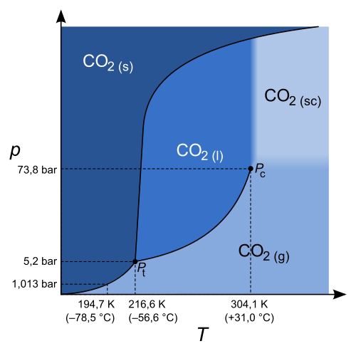 | Farbiges Phasendiagramm von Kohlenstoffdioxid (nicht maßstabsgerecht) | Eigenes Werk | Sponk | Datei:Carbon dioxide p-T phase diagram.svg | |