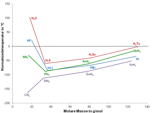 - Der Siedepunkt ist von der Stärke der Bindungskräfte zwischen den kleinsten Teilchen der flüssigen Phase abhängig: Je stärker die Bindungskräfte sind, desto höher ist der Siedepunkt, da diese zunächst überwunden werden müssten. Dies wird deutlich, wenn man beispielsweise HF und HCl vergleicht: Im flüssigen Fluorwasserstoff (Siedepunkt 20 °C) bilden die Moleküle Wasserstoffbrückenbindungen aus, während im flüssigen Chlorwasserstoff (Siedepunkt −85 °C) die schwächeren Dipol-Dipol-Wechselwirkungen vorherrschen. Gleiches gilt für den vergleichsweise sehr hohen Siedepunkt des Wassers, was deutlich wird, wenn man diesen mit Kohlenstoffdioxid vergleicht und den Einfluss der Molmassen mitberücksichtigt.